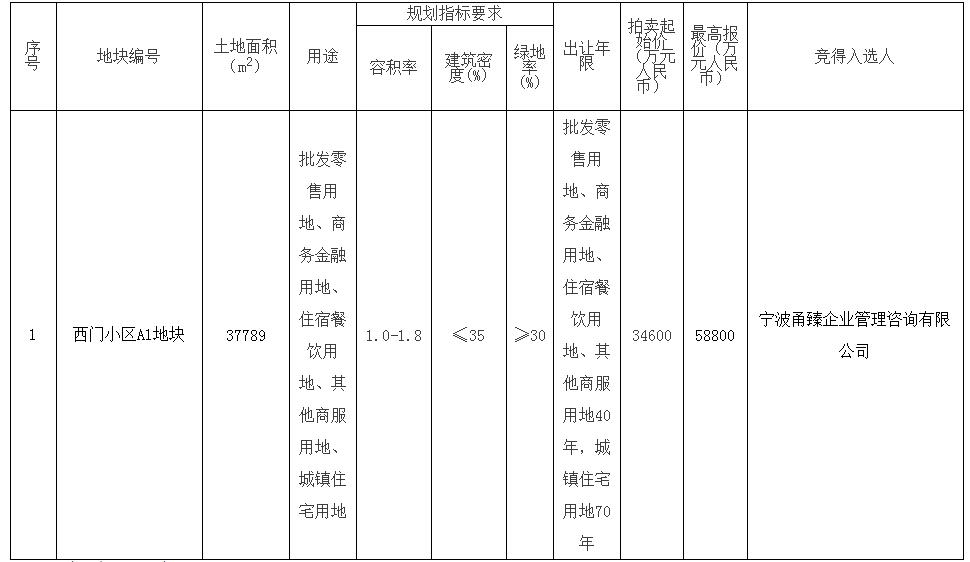 西门小区A1地块拍卖竞价结果