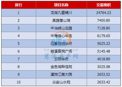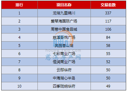 从成交排行榜上看,位于龙山镇的龙湖九里晴川以337套的成交量夺得1月份慈溪商品住宅交易套排行的冠军宝座,领跑慈溪楼市,而爱琴海国际广场以117套的成交量居于亚军位置。紧接着是去年火热的悦华府,以67套住宅成交量跻身前三甲。