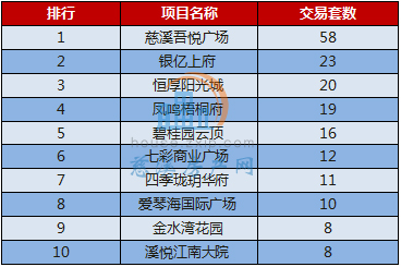 从成交排行榜上看,位于浒山街道的悦华府以21套的成交量夺得2月份慈溪商品住宅交易套排行的冠军宝座,领跑慈溪楼市,而凤鸣梧桐府以19套的成交量居于亚军位置。紧接着是位于古塘街道的四季珑玥华府,以11套住宅成交量跻身前三。