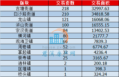 从成交区域上来看,古塘街道以月成交218套居于榜首,白沙路街道仅以8套之差位于第二,龙山镇以成交121套排名第三。