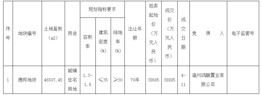 慈溪市自然资源和规划局于2019年4月10日对以下一宗国有建设用地使用权通过浙江省土地使用权网上交易系统进行拍卖出让。现将出让结果公布如下: