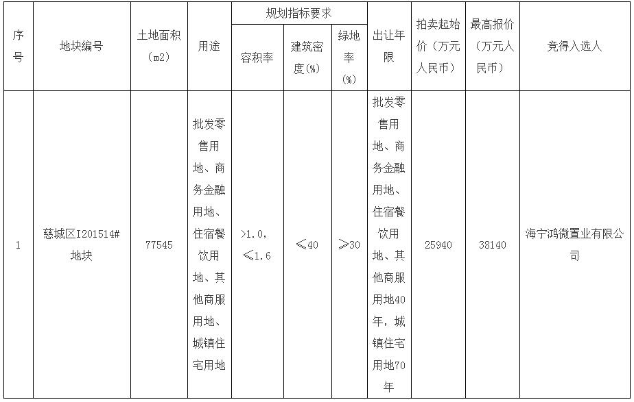 慈溪市自然资源和规划局于2019年4月30日对以下一宗国有建设用地使用权通过浙江省土地使用权网上交易系统进行拍卖出让。现将竞价结果公布如下: