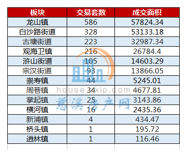 从成交区域上来看,龙山镇以月成交586套居于榜首,白沙路街道以成交323套位于第二,古塘街道以成交223套排名第三。