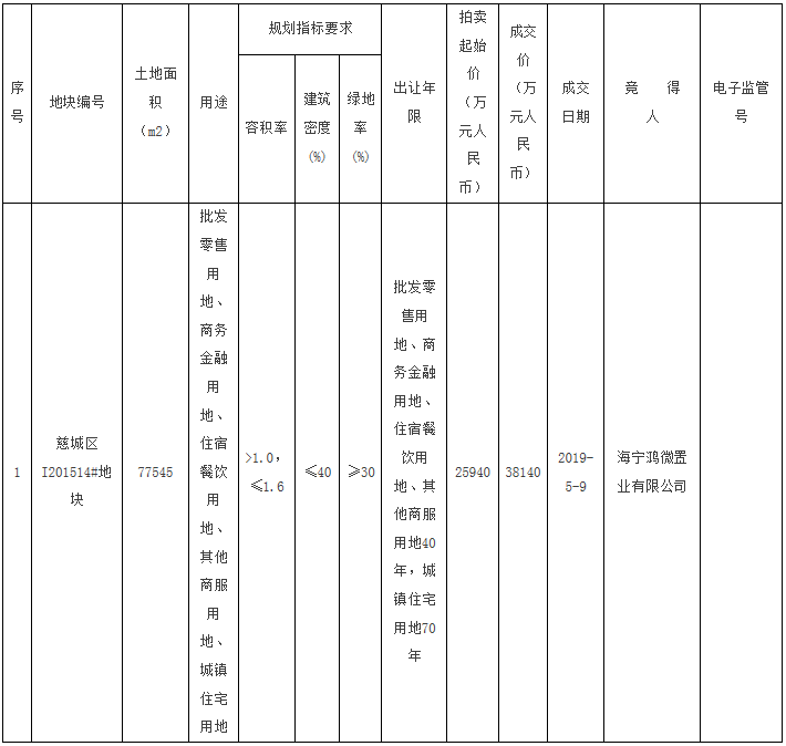 慈溪市自然资源和规划局于2019年4月30日对以下一宗国有建设用地使用权通过浙江省土地使用权网上交易系统进行拍卖出让。现将出让结果公布如下: