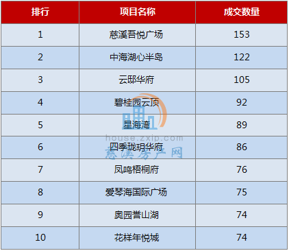 从成交排行榜上看,位于浒山街道的悦华府以153套的成交量夺得5月份慈溪商品住宅交易套排行的销售桂冠,领跑慈溪楼市,而湖心半岛花苑以122套的成交量居于亚军位置。紧接着位于古塘街道的四季珑玥华府,以106套住宅成交量跻身前三甲,成为销售季军。
