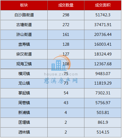 从成交区域上来看,白沙路街道以月成交298套居于榜首,成交主要来自于湖心半岛花苑、悦城壹号花园、悦城玖号花园三个项目,其次为古塘街道与浒山街道。