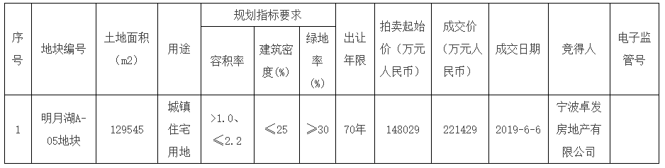 慈溪市自然资源和规划局于2019年5月31日对以下一宗国有建设用地使用权通过浙江省土地使用权网上交易系统进行拍卖出让。现将出让结果公布如下: