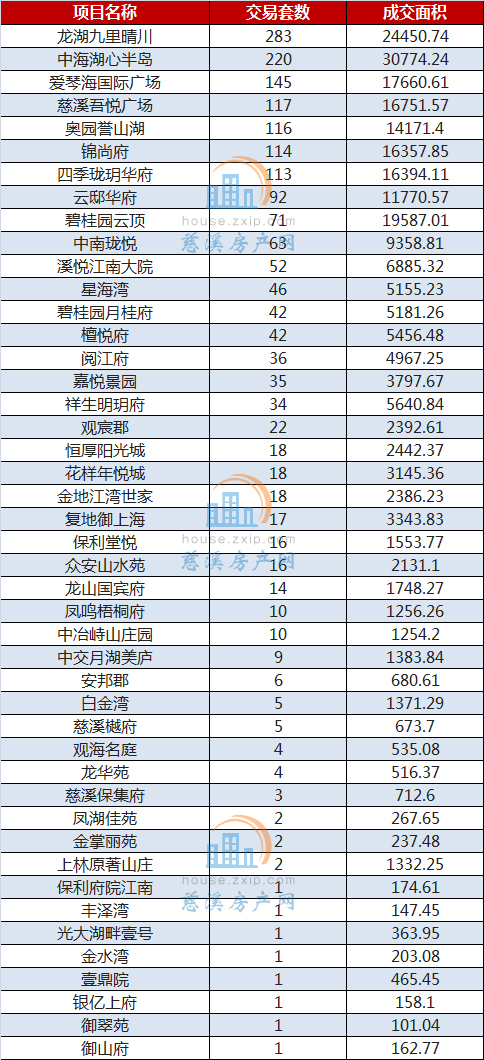 从成交排行榜上看,位于龙山镇的龙湖九里晴川以283套的成交量夺得6月份慈溪商品住宅交易套数排行的冠军宝座,领跑慈溪楼市,而湖心半岛花苑以220套的成交量居于亚军位置。紧接着是宗汉街道的爱琴海国际广场,以145套住宅成交量跻身前三甲。