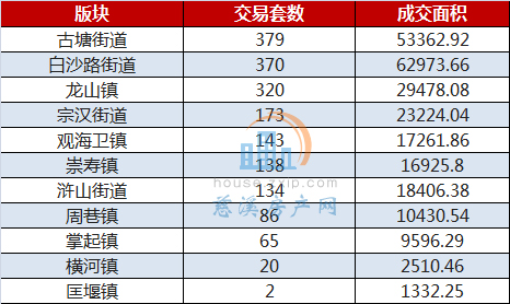 从成交区域上来看,古塘街道以月成交379套居于榜首,白沙路街道仅以9套之差位于第二,龙山镇以成交320套排名第三。