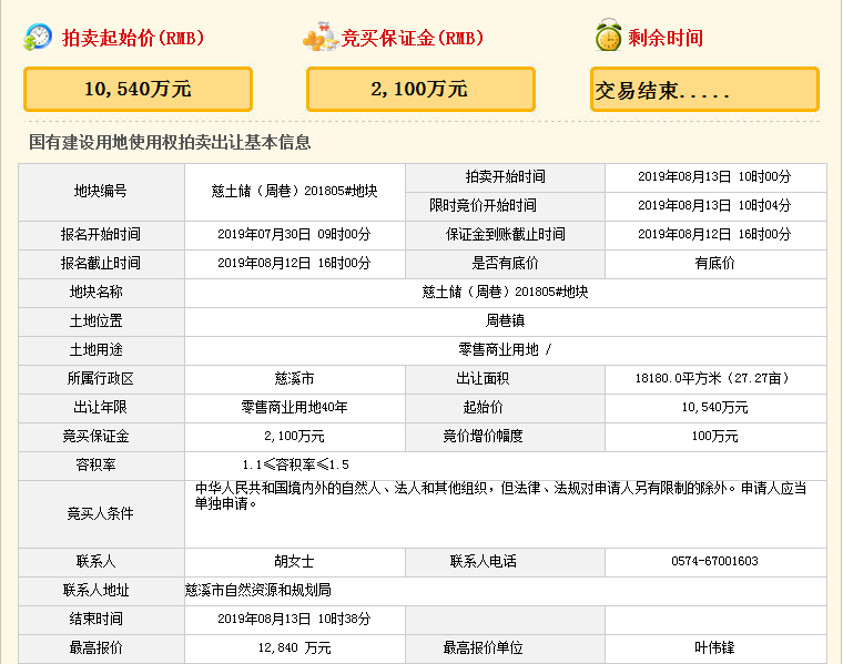 经过23轮竞拍,最终由自然人叶伟锋以楼面价4708元/㎡,总价12840万元竞得该地块,溢价率21.8%。