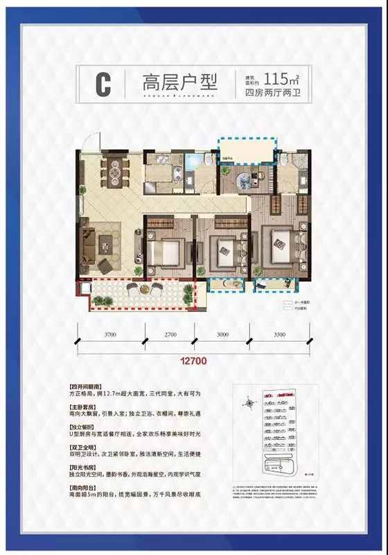 建面约115-133㎡瞰景大四房,已加推;建面约93㎡-143㎡天铂奢宅,正在销售中。