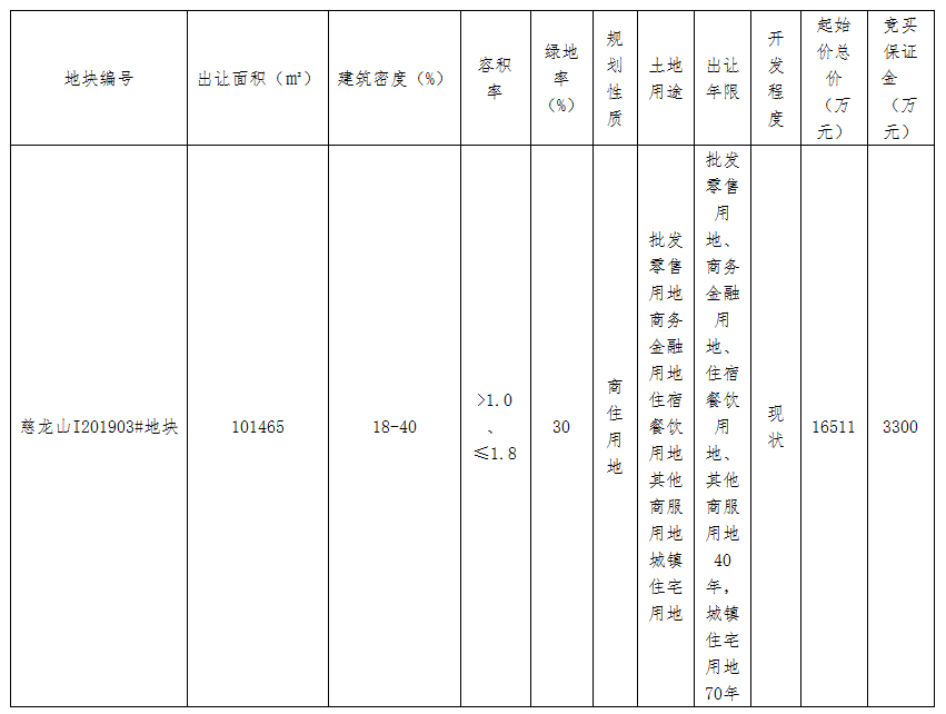 二、出让地块的规划指标、土地用途、出让年限、起始价总价及竞买保证金等如下: