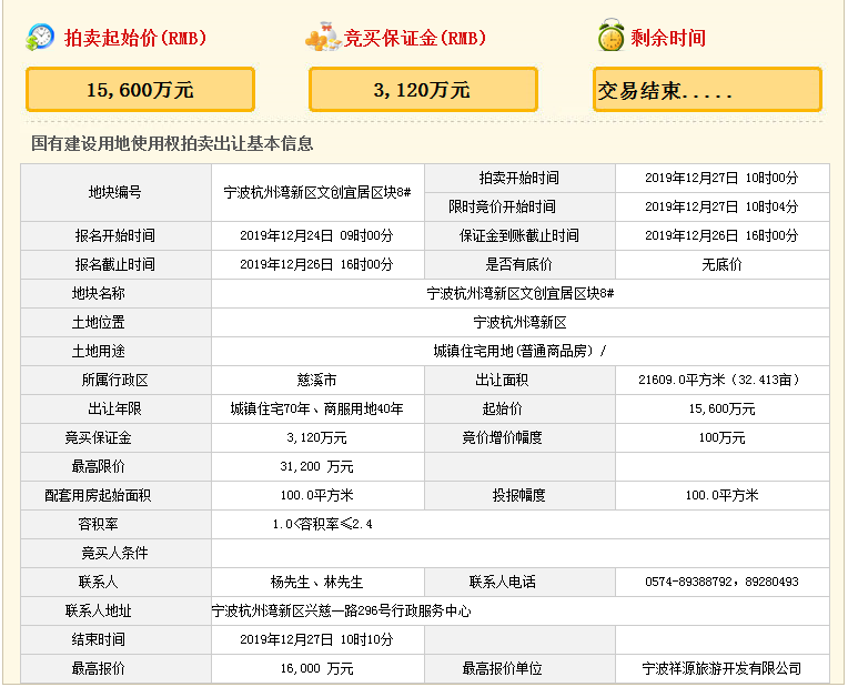 经过5轮竞拍,由宁波祥源旅游开发有限公司竞得,成交价16000万元,溢价2.6%,成交楼面价3085元/平。