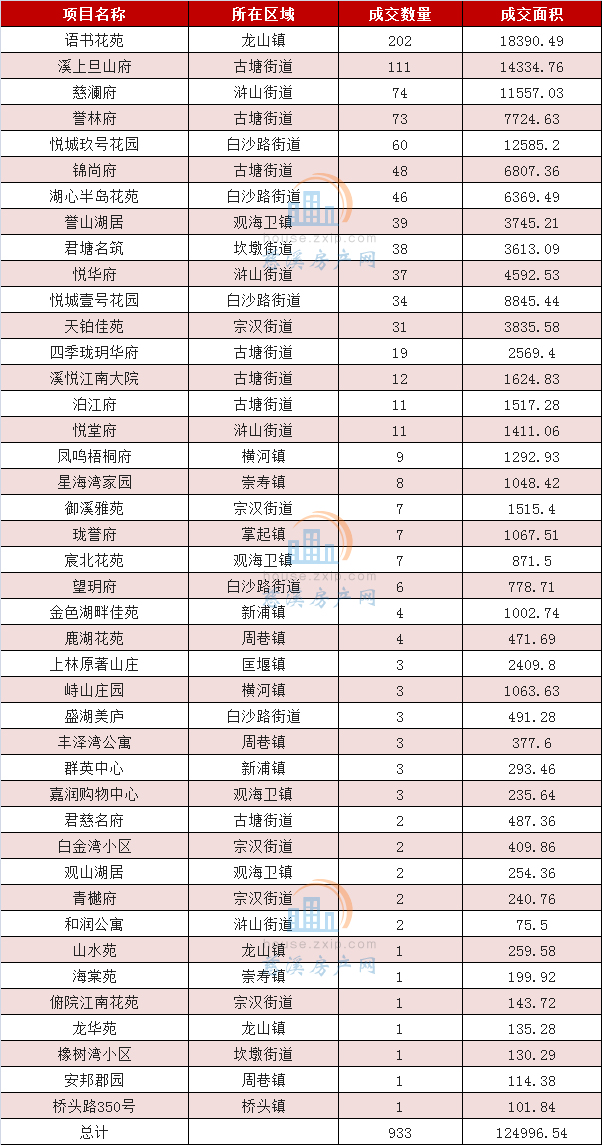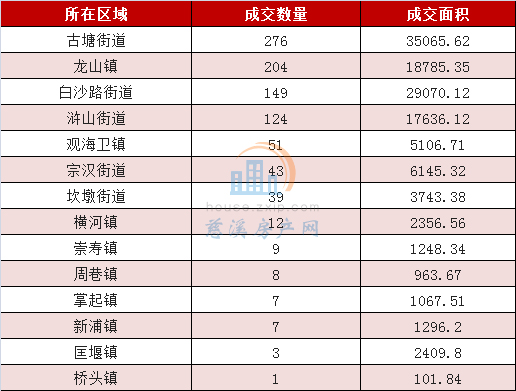 从成交区域上来看,古塘街道以月成交276套居于榜首,龙山镇以204套的成交量位居第二,白沙路街道则以149套的成交量排名第三。