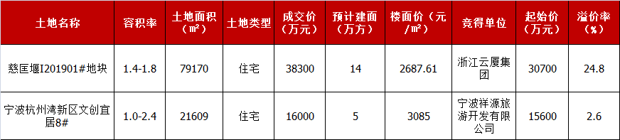 土拍方面,12月慈溪住宅土拍市场匡堰镇与杭州湾新区各成功挂牌出让一块。具体信息如下表: