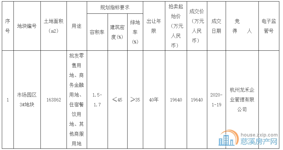 慈溪市自然资源和规划局于2020年1月17日对以下一宗国有建设用地使用权通过浙江省土地使用权网上交易系统进行拍卖出让。现将出让结果公布如下: