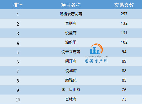 从成交排行榜上看,位于白沙路街道的湖樾云著花苑以257套的成交量夺得5月份慈溪商品住宅交易套数排行的冠军宝座,领跑慈溪楼市,而宗汉街道的青樾府以132套的成交量居于亚军位置。紧接着是浒山街道的悦堂府,以131套住宅成交量跻身前三甲。