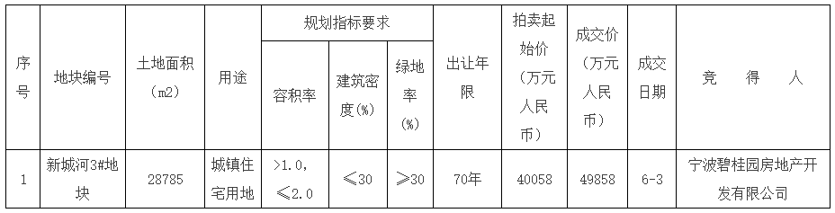 慈溪市自然资源和规划局于2020年6月2日对以下一宗国有建设用地使用权通过浙江省土地使用权网上交易系统进行拍卖出让。现将出让结果公布如下:
