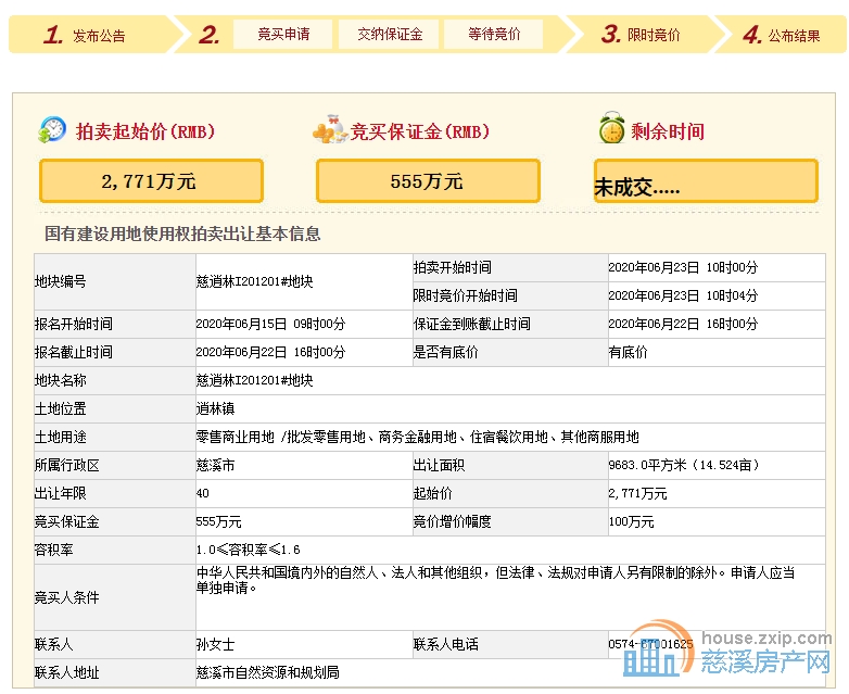 2020年6月23日上午10点,慈逍林I201201#地块因无人报名拍卖而流拍。