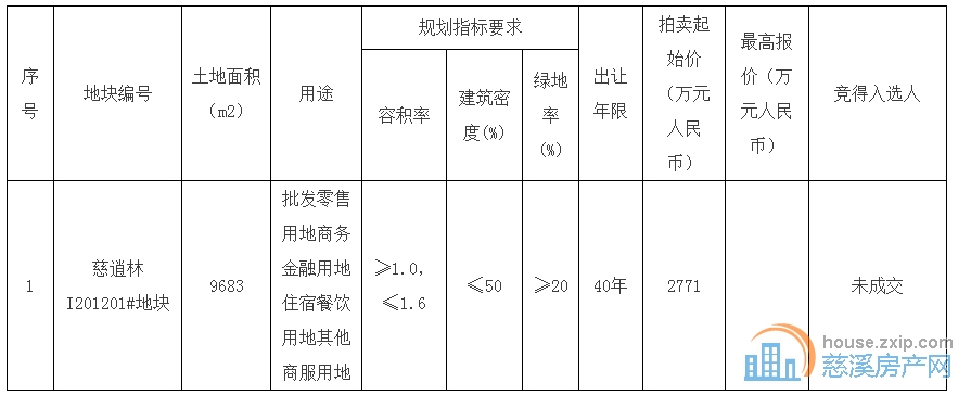 慈逍林I201201#地块拍卖竞价结果