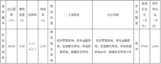 二、出让地块的规划指标、土地用途、出让年限、起始价总价及竞买保证金等如下: