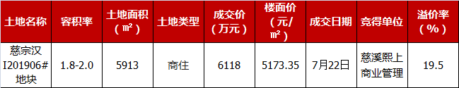 土拍方面,7月慈溪住宅土拍市场宗汉街道成功出让一块。具体信息如下表: