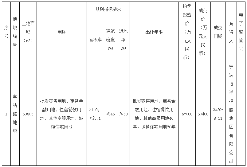 慈溪市自然资源和规划局于2020年8月4日对以下一宗国有建设用地使用权通过浙江省土地使用权网上交易系统进行拍卖出让。现将出让结果公布如下: