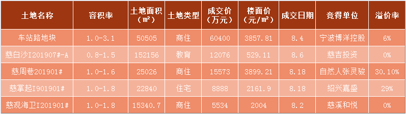 土拍方面,8月慈溪住宅土拍市场火热,共出让五宗地块,具体信息如下表: