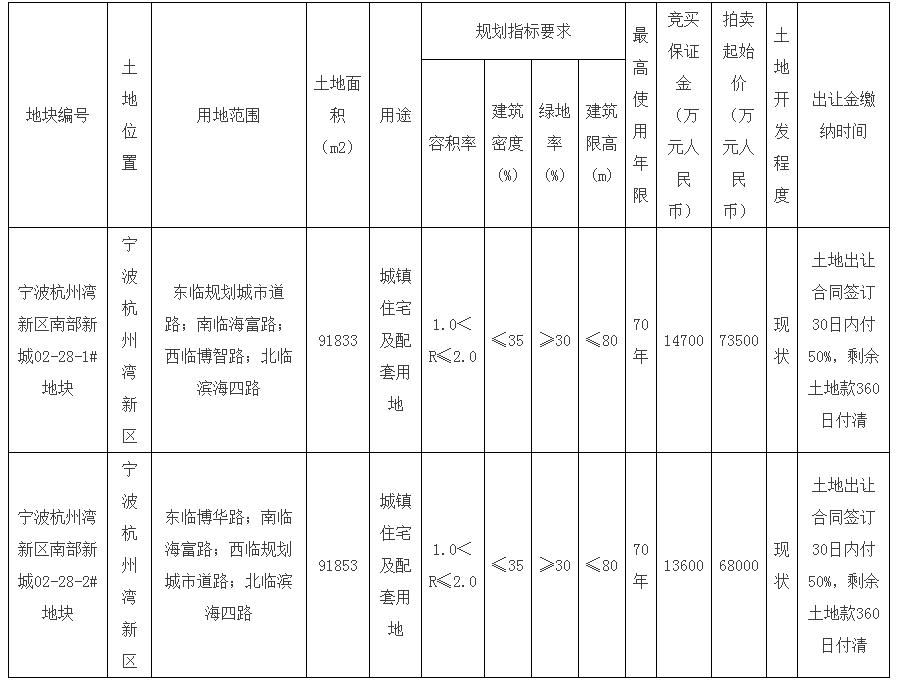 地块出让设定上限价格,宁波杭州湾新区南部新城02-28-1#地块上限价格为110200万元;宁波杭州湾新区南部新城02-28-2#地块上限价格为102000万元。在上限价格内按照价高者得原则确定竞得入选人;当竞买报价达到上限价格时,转入竞报住宅用房(人才安居专用房、保障性住房或拆迁安置房等政策性住房)程序,并按投报面积最高者得原则确定竞得入选人。竞配的住宅用房建设、房源选定、移交接受等程序参照《宁波市人才安居专用房筹集管理办法(试行)》(甬建发〔2020〕6号)执行,无偿移交新区管委会。