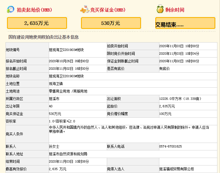 慈溪福纸贸易有限公司竞得慈观海卫I201903#地块