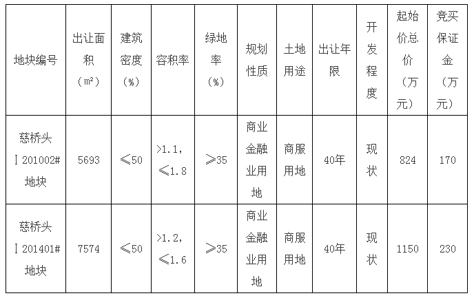 二、出让地块的规划指标、土地用途、出让年限、起始价总价及竞买保证金等如下: