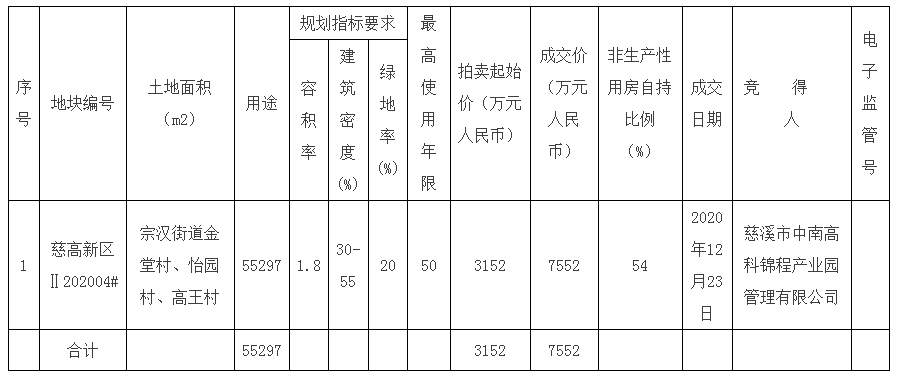 慈高新区Ⅱ202004#地块出让结果