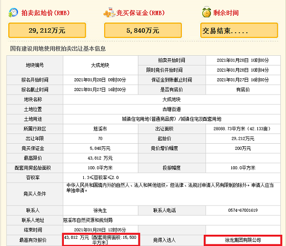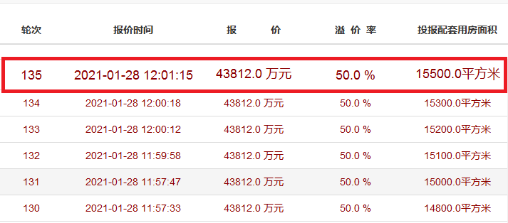 在中午12点01分,经过了135轮的竞拍后,大成地块以楼面价7799元/㎡,总价43812万元,投报面积15500㎡,溢价率50%,被徐龙集团有限公司竞得!