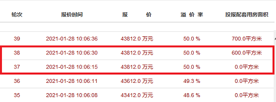 从10点04分开始竞拍后,仅过去2分钟,在第37轮便达到最高报价43812万元,溢价率50%。