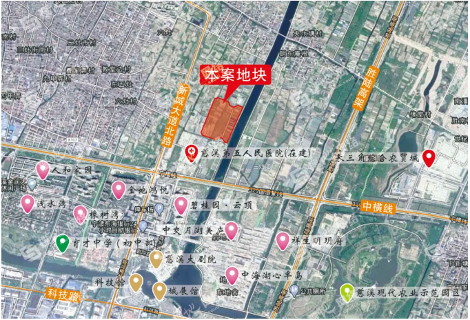 交通方面,地块周边中横线、新城大道北路等交通干线交汇贯通,可达区域内外;东侧1公里处东三环北路北向接驳慈溪互通,而在建胜陆高架也为区域人们出行提供了更加快捷的路径。