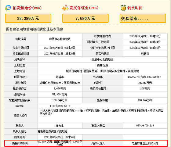 在中午12点02分,经过了72轮的竞拍后,会展中心北侧地块,以总价57389万元,投报面积1900㎡, 楼面价12707.01元/㎡,溢价率49.5%,被南通辉耀置业有限公司(金辉)竞得!