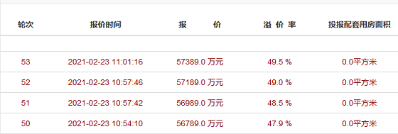 从10点30分开始竞拍后,在第53轮便达到最高报价57389万元,溢价率49.5%。