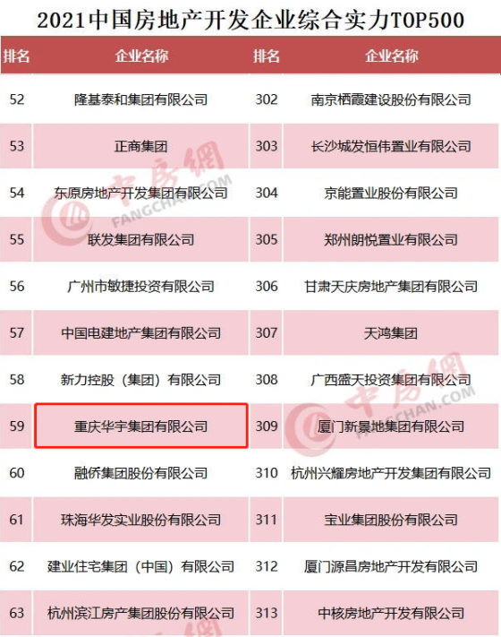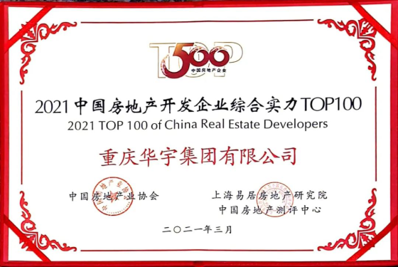 2021年3月16日,由中国房地产协会、上海易居房地产研究院、中国房地产测评中心共同举办的"2021中国房地产开发企业500强测评研究报告"正式发布。华宇集团凭借良好的企业发展战略、出色的市场表现,综合实力突显,荣获“2021中国房地产开发企业100强”第59位,“2021中国房地产开发企业经营绩效10强”第9位。