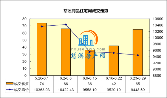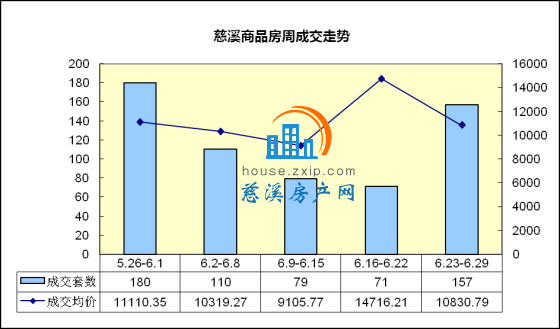 慈溪上周(6.23-6.29)成交各类房源(含住宅、公寓、商铺、写字楼和车库)共计157套,成交均价10830.79元/㎡,成交面积为12671方。环比上上周成交量上涨121.13%,成交均价下跌26.41%,成交面积上涨62.18%。