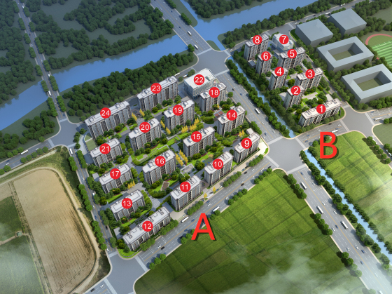 地块内总共24栋楼宇,其中7#与22#为独立商业中心,其余22栋为住宅。共942户,高楼层为12层,属于小高层,舒适宜居。