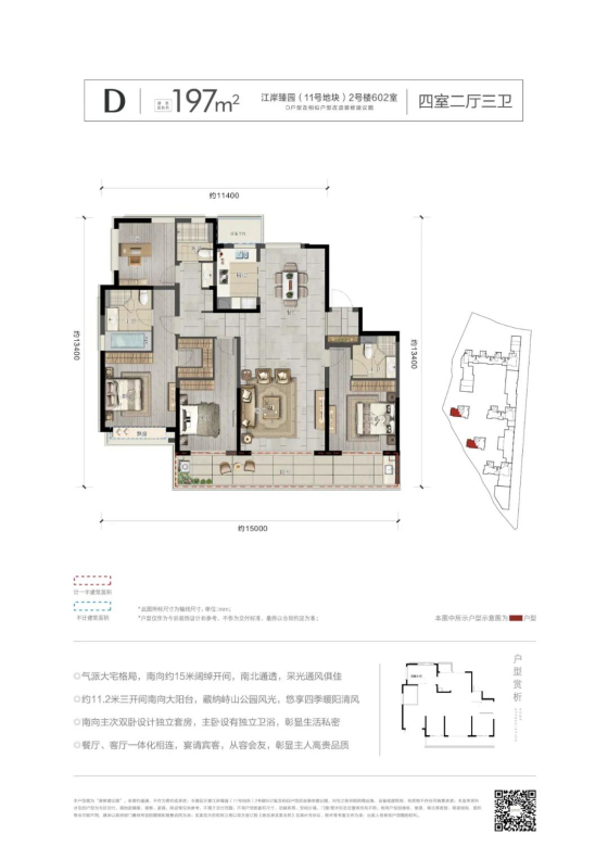 融创江岸臻园建筑面积约197㎡大四房,奢阔主卧套房是夫妻的温暖归宿,配备独立卫浴空间、走入式衣帽间和观景大飘窗,营造二人浪漫世界,拉开窗帘,纵览峙山公园无限风光,让生活充满诗意;套房式次主卧是父母的天伦之乐,设置独立卫生间,南连阔景阳台,满足父母生活需求,安享“浮生半日闲”的时光静好。