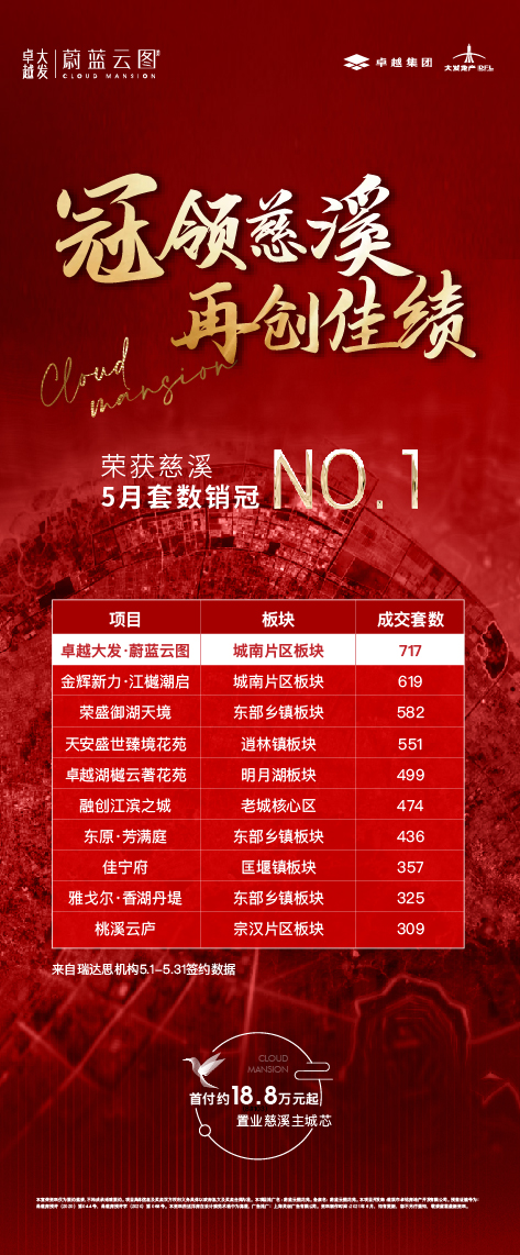 而在楼盘竞争已逼近白热化的慈溪,好楼盘才能够获得众多购房者的“芳心”,扛起成交的主力大旗。截至5月31日,卓越大发蔚蓝云图2021年以来连续5个月,以717套的成交量占领慈溪销售套数排行榜首位!