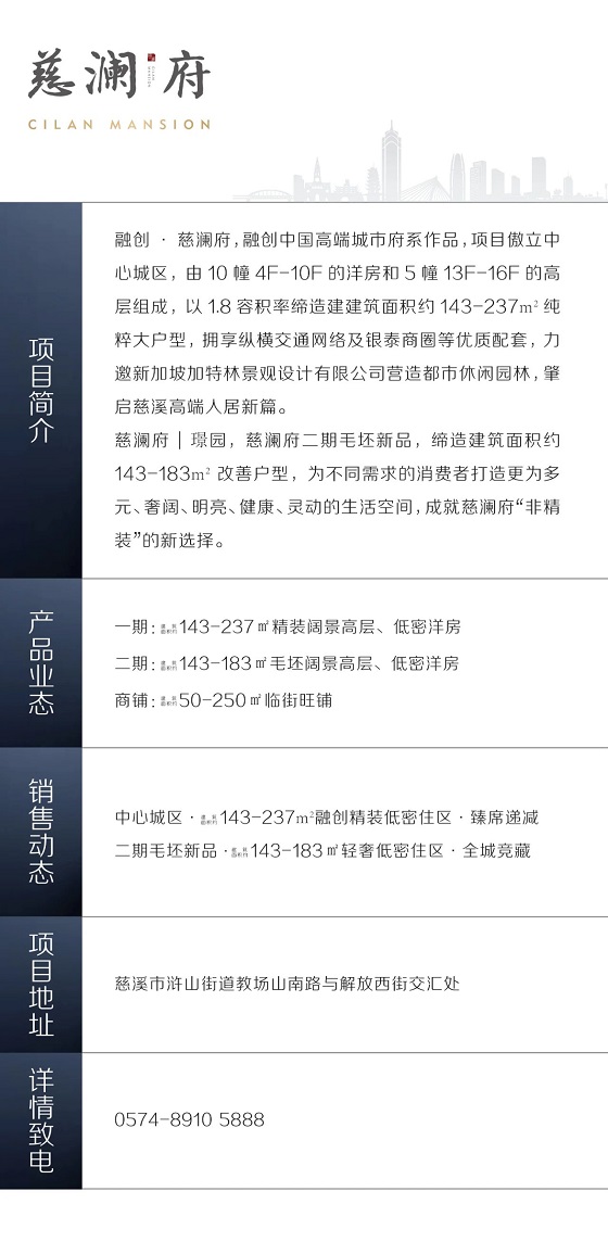 1、融创·慈澜府备案名为“慈澜府”,为慈溪西门小区A1地块备案名,开发公司为:宁波融创悦慈置业有限公司,预售证为:慈房预许字(2019)第031号、慈房预许字(2020)第026号;慈澜府|璟园备案名为“慈澜府”,为慈溪西门小区D地块备案名,开发公司为:宁波悦远置业有限公司,预售证为:慈房预许字(2020)第016号,慈房预许字(2020)第034号;慈溪西门小区A1地块和西门小区D地块系不同的开发主体,西门小区D地块为毛坯交付,特此说明;