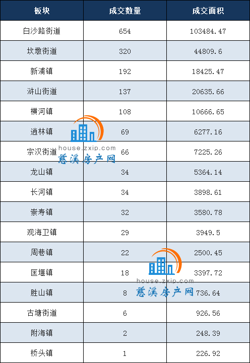 其中,白沙路街道以月成交654套居于榜首,其次是坎墩街道以320套的成交量位居第二,新浦镇以192套的数据紧随其后。
