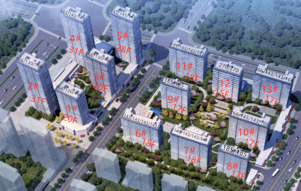 项目总占地约182.5亩,总建筑面积约13万方,容积率1.96,位于新城河版块。项目由13幢高层组成,规划总户数811户。打造建面约130-270㎡纯改善宽景平邸。物业为滨江物业。