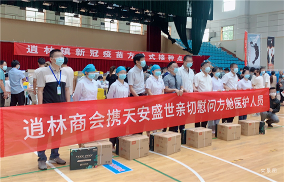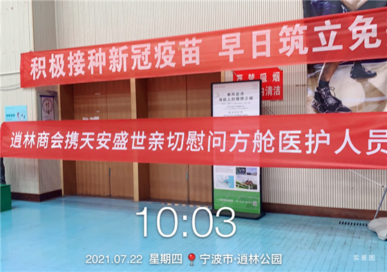 7月22日,逍林商会携天安·盛世臻境,开展慰问送清凉活动,为逍林公园篮球馆方舱医院的一线防疫人员送去清凉降温礼包,以绵薄之力感谢抗疫工作者的辛勤付出。