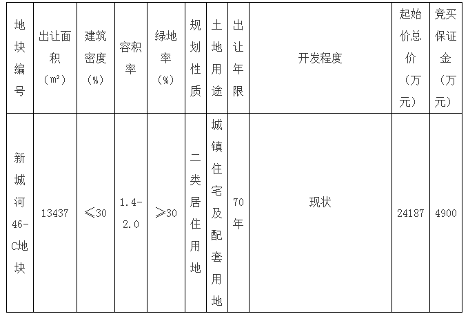 新城河46-C地块出让设定上限价格,上限价格为31387万元。在上限价格内按照价高者得原则确定竞得入选人;当竞买报价达到上限价格时,转入在上限价格的基础上竞报住宅用房(人才安居专用房、保障性住房或拆迁安置房等政策性住房,含对应比例的停车库或停车位)程序,并按投报面积最高者得原则确定竞得入选人。
