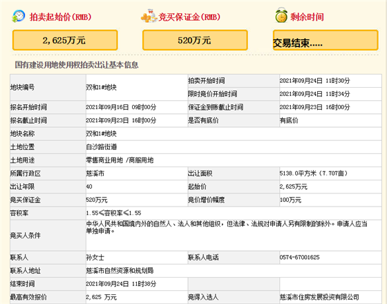 双和1#地块出让面积5138㎡,总建筑面积10802㎡,建筑密度41.6%,容积率1.55,土地用途为商服用地,出让年限40年,起始总价2625万元。由慈溪市住房发展投资有限公司底价成交,楼面价3296.12元/㎡。