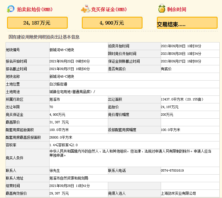 上午10:34新城河46-C地块竞价开始。经过27轮竞价,最终由上海劲米实业有限公司(红星美凯龙)以总价29387万元竞得,楼面价10935元/㎡,溢价率21.5%。目前红星美凯龙在新城河板块已有红星檀府项目。