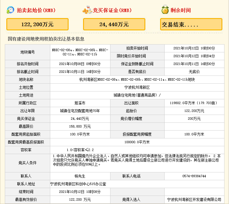 2021年10月12日10点04分,杭州湾新区NBXC-02-08a、NBXC-02-08b、NBXC-02-11a、NBXC-02-11b地块以4636元/平方米的楼面价、122200万元的底价成交,竞得者为宁波杭州湾新区开发建设有限公司。